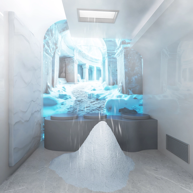 Zachte droge sneeuw komt via het dak in de cabine bij een omgevingstemperatuur van – 10 graden Celcius. De sneeuw blijft liggen waardoor sneeuw gebruikt kan worden om de huid extra te koelen.