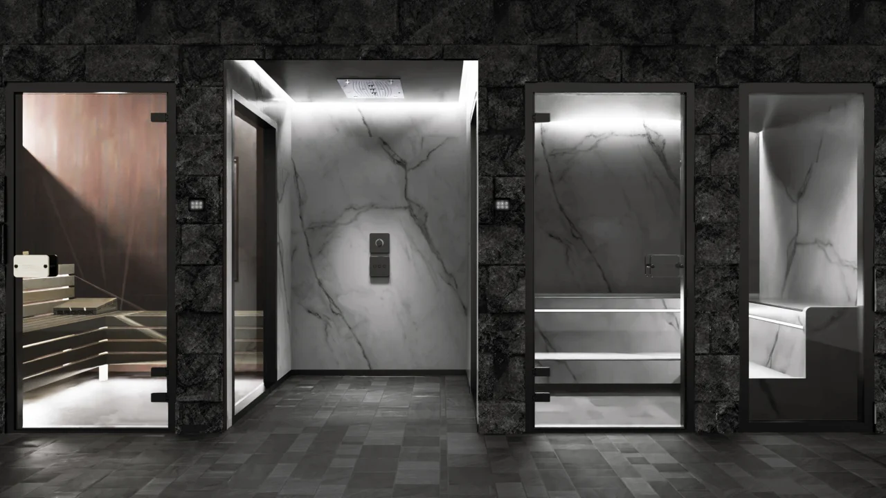 Well-equipped sauna with automatic fragrance dosing system, color therapy, Saunsation.