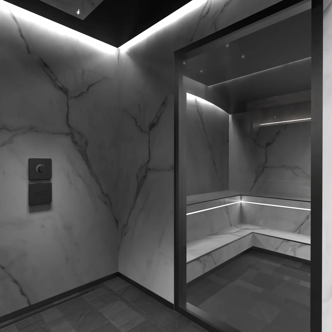 The wellness shower is equipped with a beautiful roof shower, side shower and hand shower