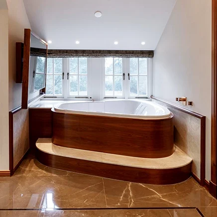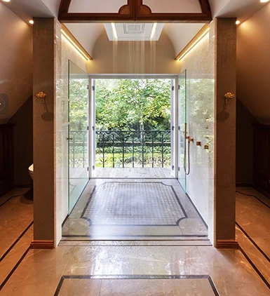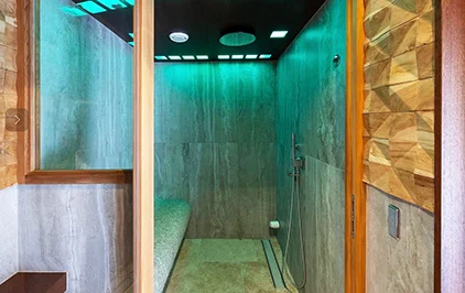 Salle de bain luxueuse avec tout le confort. Douche de bien-être, bain à remous et bain de vapeur carrelé.
