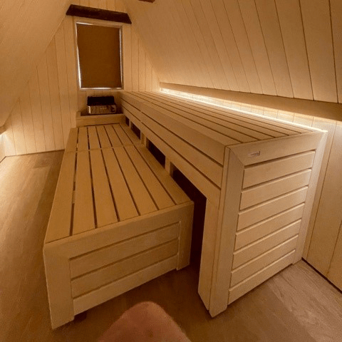 Un sauna fait sur mesure par Cleopatra dans un grenier. Le sauna est fabriqué en bois de tremble de première qualité. L'éclairage LED indirect lui confère un aspect luxueux.