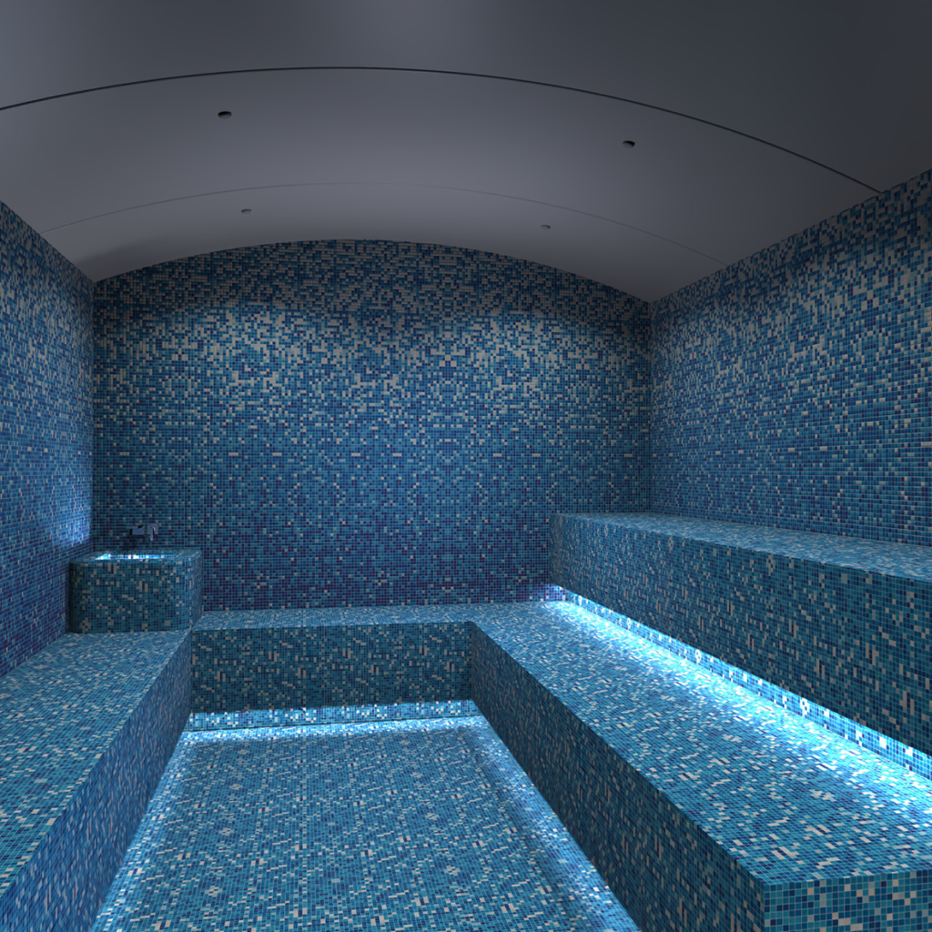 Een fraaie gevormde Hamam van alle gemakken voorzien. Banken, stoom, dakdouche en mooie LED verlichting.