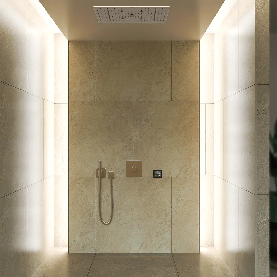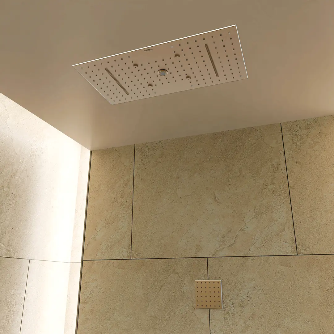 Funkcjami prysznica (prysznic dachowy z 4 rodzajami strumienia) można łatwo sterować za pomocą wyświetlacza dotykowego, do którego dołączona jest wkładka umożliwiająca montaż w ścianie.