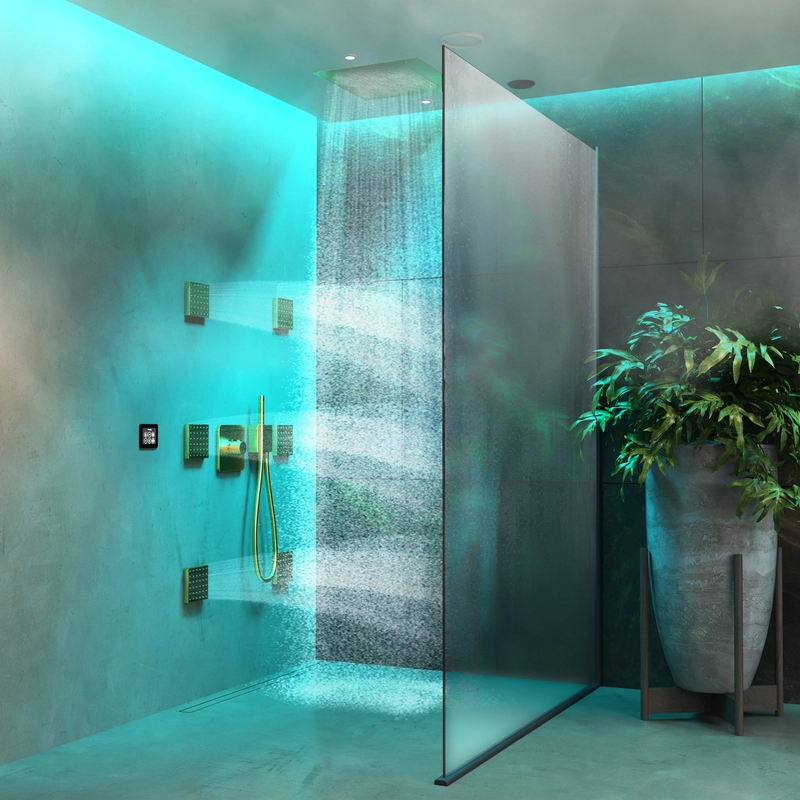 De Wellness Shower kan op verschillende merken kranen en douches worden aangesloten. Via de Shower Deluxe bediening kunnen de verschillende douches geactiveerd worden. Het aantal douches bepaalt hoeveel gebruikers men op de Wellness Shower nodig dient te hebben. Geeft u de voorkeur aan een dakdouche en zijdouches dan voldoet een 4 verbruiker. Wilt u meerdere douches (hand, zij en dakdouche) aansturen dan geniet wellicht de 6, of 8 gebruiker de voorkeur. Let op dat de druk en hoeveelheid water (debiet) van te voren bekend is en dat de waterhuishouding hierop is ingericht. Bij de Wellness Shower is altijd een separate thermostaatkraan nodig.